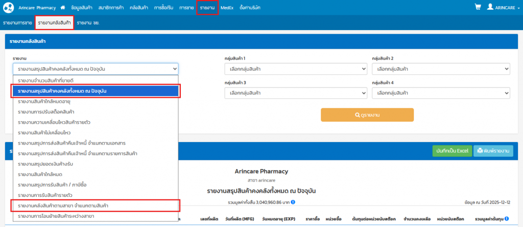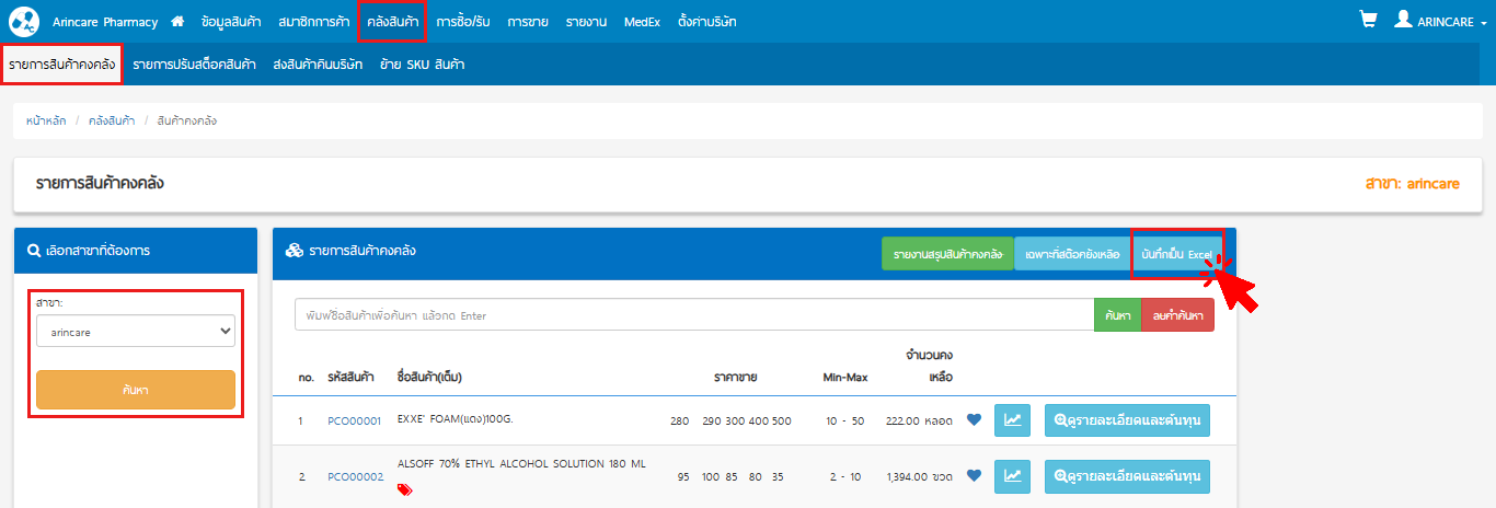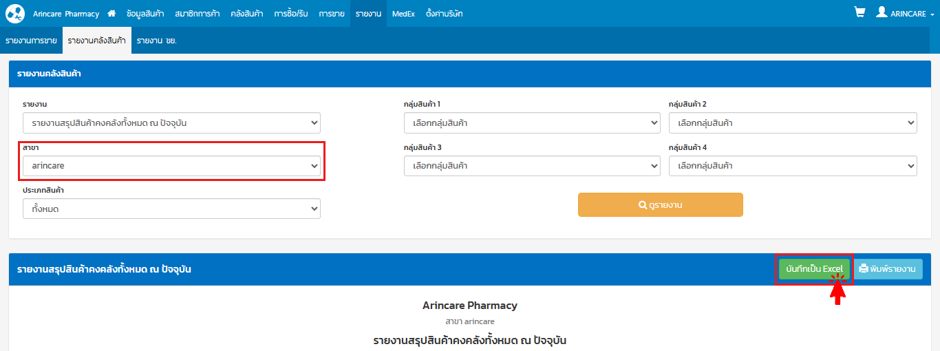 หัวข้อ ‘รายงาน’ > รายงานคลังสินค้า > เลือก รายงานที่ต้องการ > เลือก สาขา > กดปุ่ม ‘บันทึกเป็น Excel’
