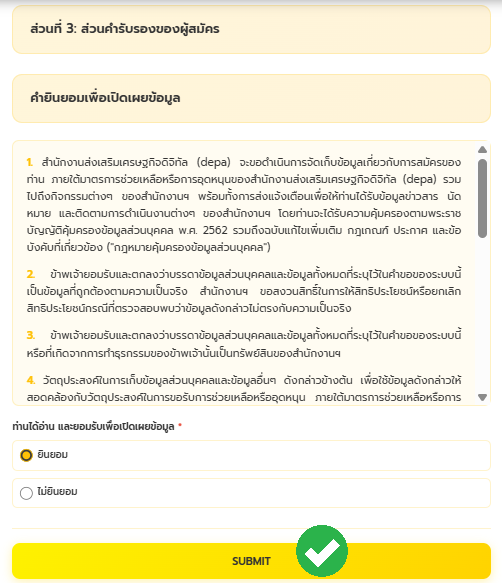 กดเลือก ‘ยินยอม’ ตรวจสอบข้อมูลครบถ้วนเรียบร้อยแล้ว กดปุ่ม ‘SUBMIT’